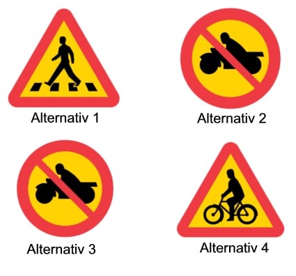 Intjänade Poäng(s): 0 av 0, (0) Vilket påstående angående periferiseende är sant? Vad är “Gula fläcken” för något? Vilken körkortsbehörighet krävs för att få köra en buss med en totalvikt av 26 ton? Du har ett B-körkort. Får du köra denna traktor? Du har B-körkort och har fyllt 21 år. Får du köra denna motorcykel? På bilden ser du en Personbil klass 2 (Husbil). Får en förare med B-körkort köra detta fordon? Du har B-körkort. Får du köra en personbil klass 1 med tillkopplad släpkärra? Vilket är det vanligaste straffet för grovt rattfylleri? Var går gränsen för rattfylleri? När är det svårast att bedöma avstånd och hastighet hos andra fordon? Vad är trängselskatt? Vad är sant när det gäller reaktionssträckan? Vad menas med reaktionssträcka? Vad menas med fartblindhet? Hur gamla bör barn vara innan de får cykla på egen hand i trafiken? Ett föremål har en rörelseenergi på 30 kg när fordonet färdas i en hastighet av 10 km/h. Hur mycket är rörelseenergin när fordonet färdas i 110 km/h? Vad är en synvilla? Vad är sant beträffande läkemedel och bilkörning? Vad är sant beträffande sms i samband med bilkörning? Vad är sant beträffande trötthet? Vad menas med vargtimmen? Vad är sant beträffande äldre förare över 75 år? En katalysator renar tre olika ämnen. Vilka? Hur stor del av det totala nationella utsläppet av koldioxid kommer från Sveriges alla motordrivna fordon? Du kör bil nr. 1 och avser att köra rakt fram. Vilken/vilka andra bilar är du skyldig att lämna företräde? Vilken hastighet gäller där bilen befinner sig? Du kör bil nr. 1 och avser att svänga till vänster. Vilken/vilka andra bilister är du skyldig att väja för? Du kör på en landsväg och efter det att du har passerat detta vägmärke, kommer du ikapp denna moped. Vad är sant? Om du kör i 70 km/h kommer du 70 km eller 7 mil på en timme. Men hur många meter förflyttar du dig per sekund när du kör i 70 km/h? Vilket av nedanstående ämne/ämnen orsakar försurning i grundvatten och sjöar? Vad menas med begreppet imitationsinlärning? Vad menas med så kallad djupinlärning? Vilken är lägsta behörighet för att få köra denna moped? Vilket av nedanstående fordonsbränslen räknas inte som ett FOSSILT bränsle? Dieselmotorer är utrustade med partikelfilter. Varför? När ska du enligt lagen ge tecken med körriktningsvisare? Vilket av nedanstående ämne orsakar marknära ozon och kan vara cancerframkallande? Vilket av nedanstående ämne/ämnen orsakar förgiftning/kvävning om man andas in detta? Är det tillåtet att vända som bilden visar? Vad är sant beträffande motorväg? Vilket av nedanstående fordon får inte köra på motorväg? Vad är rätt när det gäller grupptryck? Vad menas med begreppet sannolikhetsinlärning? You arrive in the evening on 31/10 and plan to park until the morning of the following day. Have you then parked your blue car on the right side? Är det tillåtet att köra om traktorn efter förbudsskylten? Vad betyder denna vägskylt? Du kommer ikapp detta fordon. Är det tillåtet att köra om? Vad betyder skyltkombinationen? Vad betyder skylten? Vad betyder skylten? Vad betyder skylten? Vad betyder skylten? Du möter en lastbil på en hal och smal väg. Vad ska du göra? Vad kallas denna olyckstyp? Får du påbörja en omkörning när någon bakomvarande redan har påbörjat en omkörning? Du kör på en väg med dubbla körfält i din färdriktning. Har du då rätt att köra om i det högra körfältet? Får du stanna på huvudled för att släppa av en passagerare? Är det förbjudet att köra för sakta? Du är ute och cyklar när du upptäcker denna skylt. Får du cykla förbi denna skylt? Vad innebär högerregeln? Vilken betydelse har den gröna pilen i en trafiksignal? Vilka av nedanstående fordon FÅR använda vägrenen? Vilka av nedanstående fordon SKA använda vägrenen? Om du kör på eller på annat sätt rubbar en trafikanordning, vad är du då skyldig att göra? Som förare är du skyldig att lämna fri väg för viss trafik. vilken/vilka? Hur många personer skadas i trafiken varje år? Hur många personer skadas allvarligt i trafiken i Sverige varje år? Hur många personer dödas i trafiken i Sverige varje år? Vilket påstående är sant när det gäller risken för vilt på eller vid sidan av vägbanan? Vilka av nedanstående grupper är inblandad i flest trafikolyckor? Varför har man glykol i kylarvätskan? Hur ska du passera en buss som står vid en busshållplats? Vad betyder vägmärkeskombinationen på bilden? Vad innebär vägmärket på bilden? Vilken väjningsregel gäller vid en vänstersväng? Vad är sant angående bilbälten i en personbil? Vad ser du för vägmarkeringar på bilden? Vad betyder denna skylt? Vilket påstående angående hörsel är korrekt? Vilken är bashastigheten utanför tätbebyggt område? Vad är sant när det gäller stressade förare? Varför är impulsiva förare ofta olämpliga som förare? Du har BE-körkort som du tog under 2014. Vid vilket av nedanstående alternativ är det tillåtet för dig att köra denna kombination? Du har ett utökat B-körkort (B96). Vid vilket av nedanstående alternativ är det tillåtet för dig att köra denna kombination? Du har ett B-körkort. Vid vilket av nedanstående alternativ är det tillåtet för dig att köra denna kombination? Var går gränsen för drograttfylleri? Hur lång reaktionstid räknar man med att en genomsnittlig förare har, när det uppstår en olyckssituation i trafiken? Det finns alltid undantag men vilket påstående är generellt sett korrekt när det gäller äldre förare över 75 år? Hur många centiliter starksprit (40 %) motsvarar 33 cl starköl (5.5 %)? Vilka handlingar ska du medföra när du kör personbil, lastbil, buss och mc? Vilken är den högsta tillåtna hastigheten för detta fordon? Vilken är den högsta tillåtna hastigheten för detta fordon? Vilke